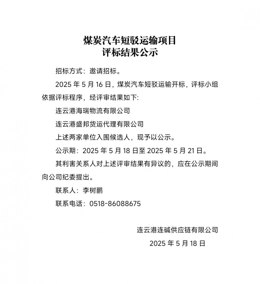 連云港連堿供應(yīng)鏈有限公司煤炭汽車(chē)短駁運(yùn)輸項(xiàng)目評(píng)標(biāo)結(jié)果公示
