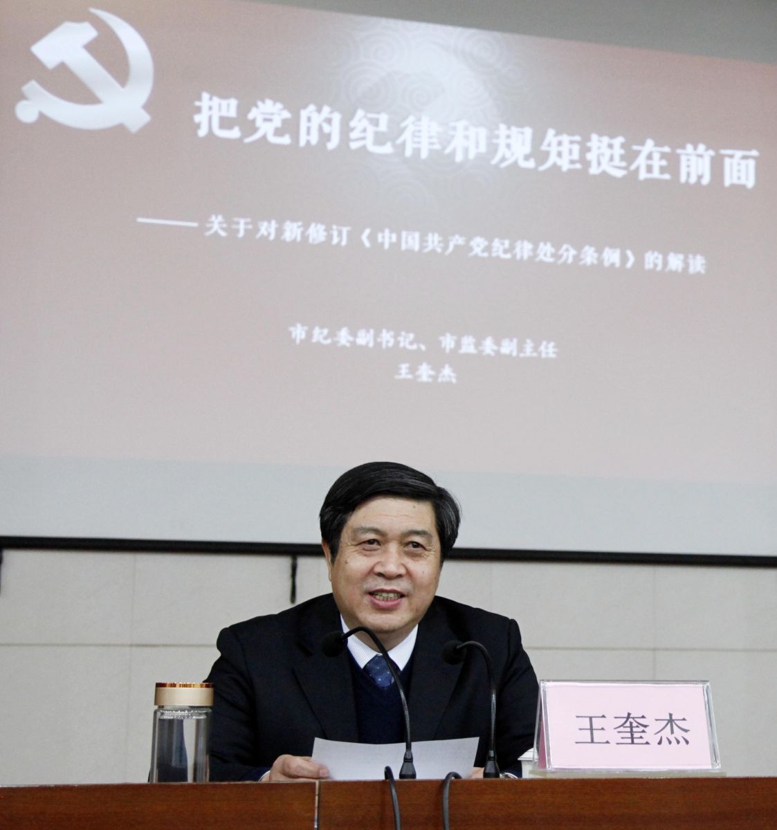 為了讓廣大黨員干部更好地把《中國(guó)共產(chǎn)黨紀(jì)律處分條例》學(xué)深悟透、融會(huì)貫通,12月21日,公司特邀市紀(jì)委副書(shū)記、市監(jiān)委副主任王奎杰對(duì)新修訂的《條例》進(jìn)行了專題解讀。市國(guó)資委黨委成員王懷東、公司領(lǐng)導(dǎo)、中層干部、關(guān)鍵崗位主管人員共100余人參加了學(xué)習(xí)。