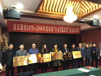 12月11日下午,連云港市2015-2016年度省級“守合同重信用”企業(yè)培訓(xùn)班在明珠大酒店舉行,會議進行了授牌儀式,我公司榮獲省級“守合同重信用”單位。
