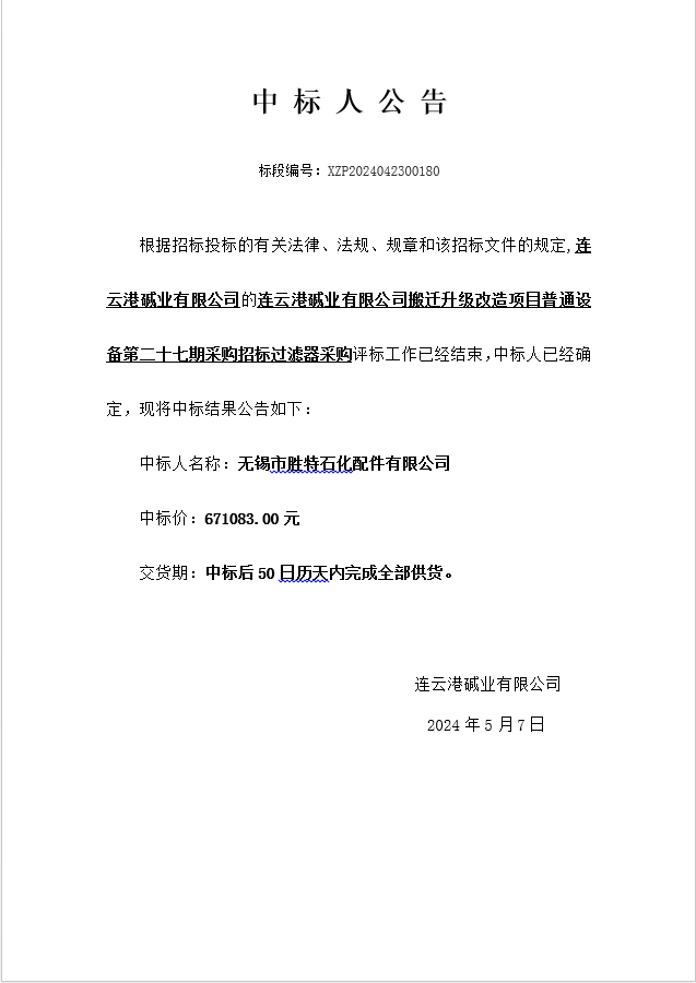 搬遷升級(jí)改造項(xiàng)目普通設(shè)備第二十七期采購(gòu)招標(biāo)過濾器采購(gòu)中標(biāo)人公告