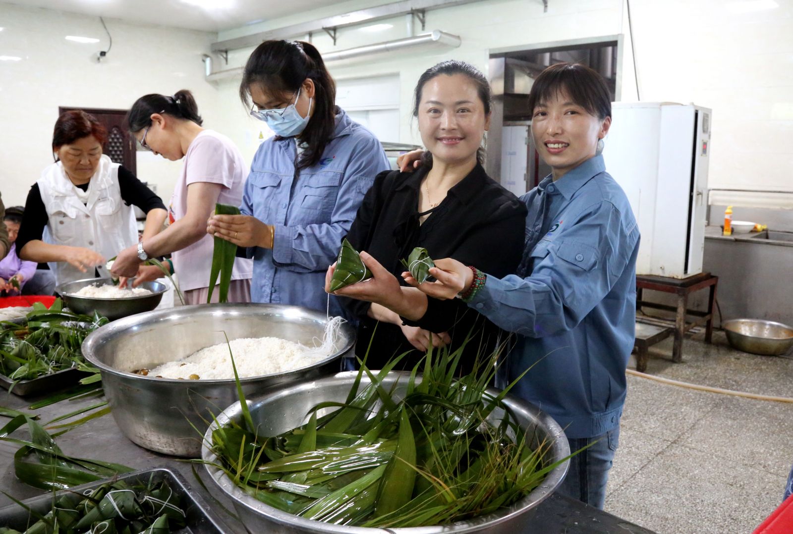 活動現(xiàn)場,食堂工作人員將提前準(zhǔn)備好的糯米、粽葉、棉線、剪刀等材料一一擺放,大家圍在一起互相幫助、密切交流,卷葉、放米、裹葉、扎線等動作一氣呵成。經(jīng)過一天的忙碌,在眾人的巧手制作下,1600多個造型各異的粽子誕生了,活動現(xiàn)場洋溢著歡聲笑語。食堂的廚師加班加點將粽子和鴨蛋全部煮熟,涼透保存好,保證了6月7日中午就餐窗口粽子和鴨蛋的特色供應(yīng)。