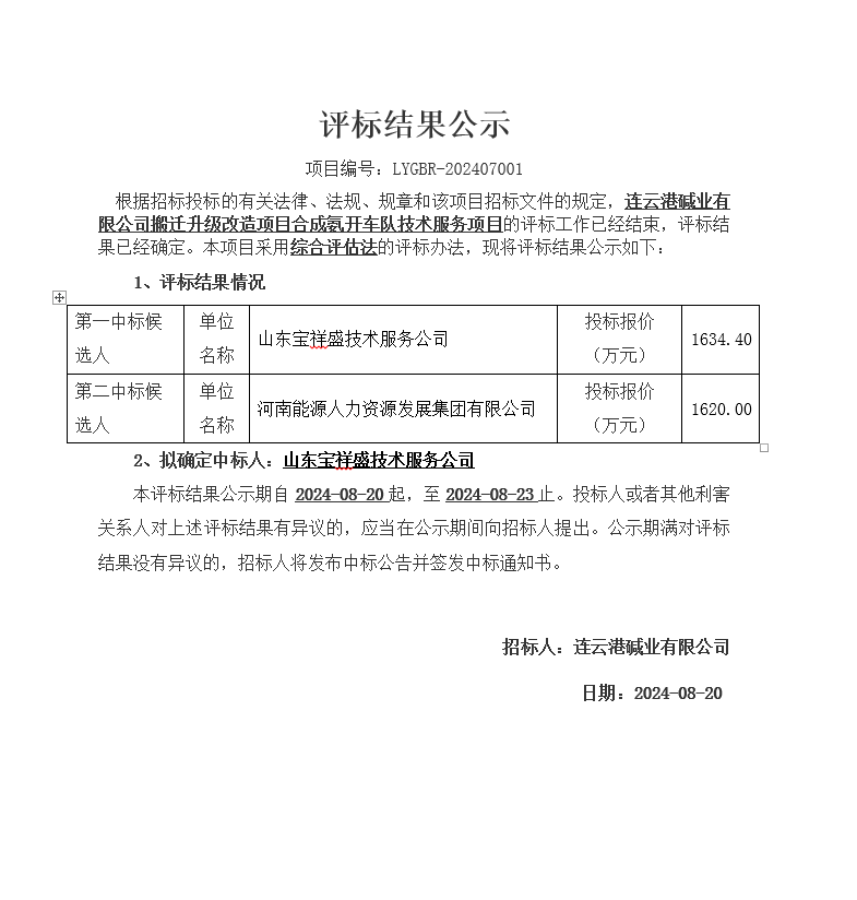 搬遷升級改造項目合成氨開車隊技術(shù)服務(wù)項目評標(biāo)結(jié)果公示